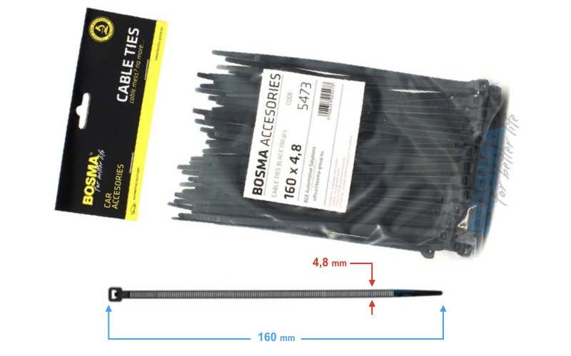 Opaska zaciskowa BOSMA o wymiarach 4,8 x 160 mm w kolorze czarnym. Produkt dostępny w opakowaniu zawierającym 100 sztuk. Służy do mocowania i organizacji przewodów oraz innych elementów w warsztacie.
